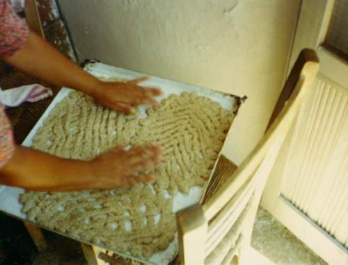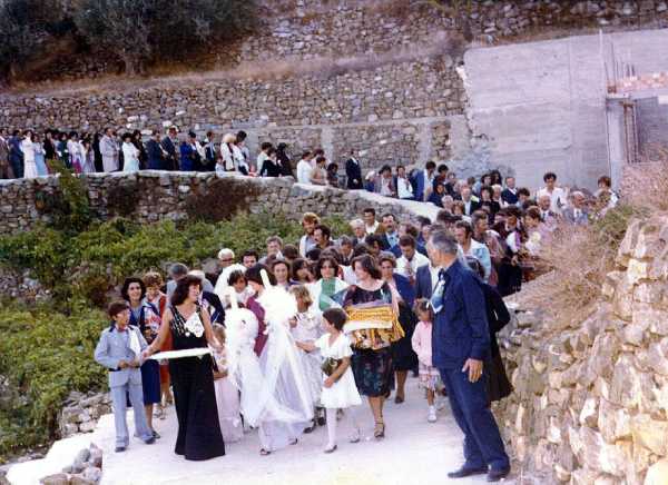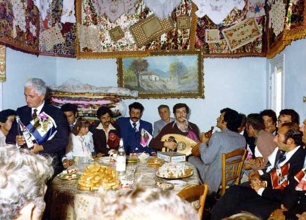 On the third day the whole town is invited by a procession led by banners visiting all the houses. A glenti follows. On the fourth day the wedding itself occurs. All friends and family of the bride and groom gather at their respective houses. Praises are sung to each while the town musicians play. These groups, with the musicians playing in the lead, head for the church and meet groups, with the musicians playing in the lead, head for the church and meet outside the same, where the couple unites and enters the church. After the religious ceremony a glenti, lasting all night of course, occurs. On the last day, all meet again outside the couples house and the man of honor attempts to persuade the couple to emerge by singing promises he would keep if they do appear.